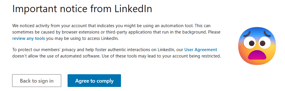 Depending on the technical skills and carefulness of the developing team who has built the scraper, the risk of being detected by Linkedin varies. If your scraping tool is done right, then it should mimic a real user, with a consistent web fingerprint, a clean IP address and human-like behavioural patterns. If your scraping tool has been implemented poorly, it will be perceived as robotic by Linkedin, and your Linkedin account will receive the following warning: