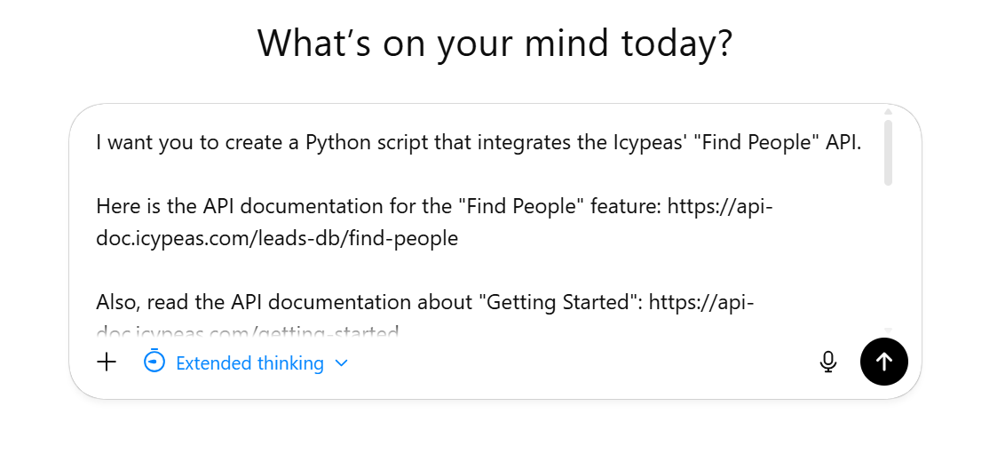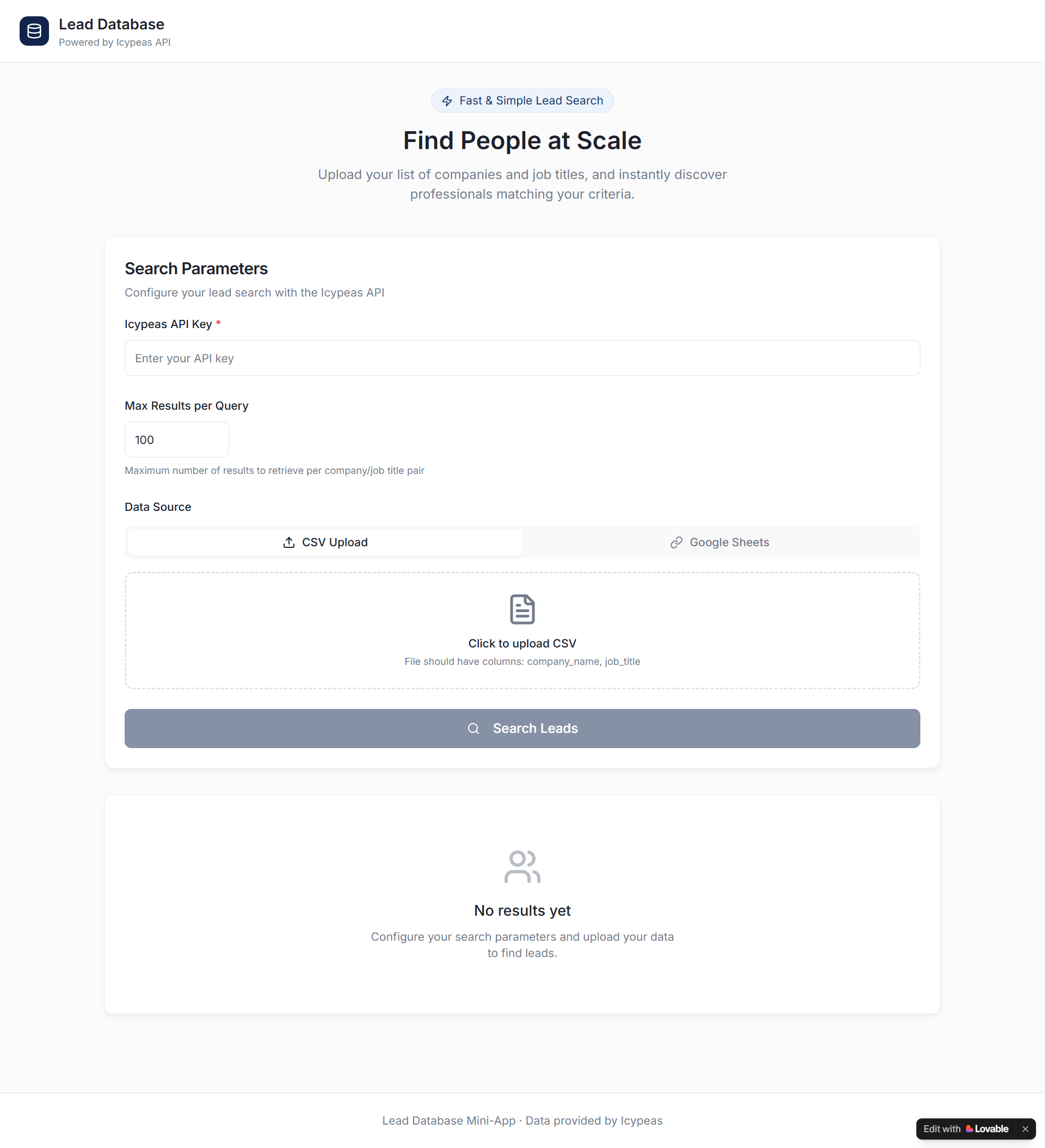 As before, we’re going to integrate Icypeas’ Find People API. But this time, we’ll ask Lovable to produce a small web application with a graphical interface, to make it easier to use the Find People API.