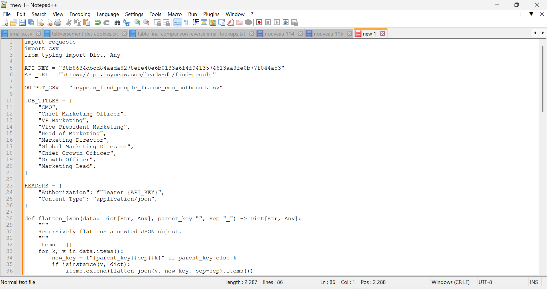 2. Backend Processing Retrieve the API Key from the form. Extract the list of companies and job titles from the CSV upload or Google Sheet. For each pair (company, job title), call the Icypeas API Find People endpoint with these parameters. Aggregate all results into a single global list.