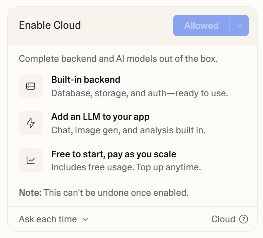 Lovable will ask if you want to "Enable Cloud". Click on "Allow":