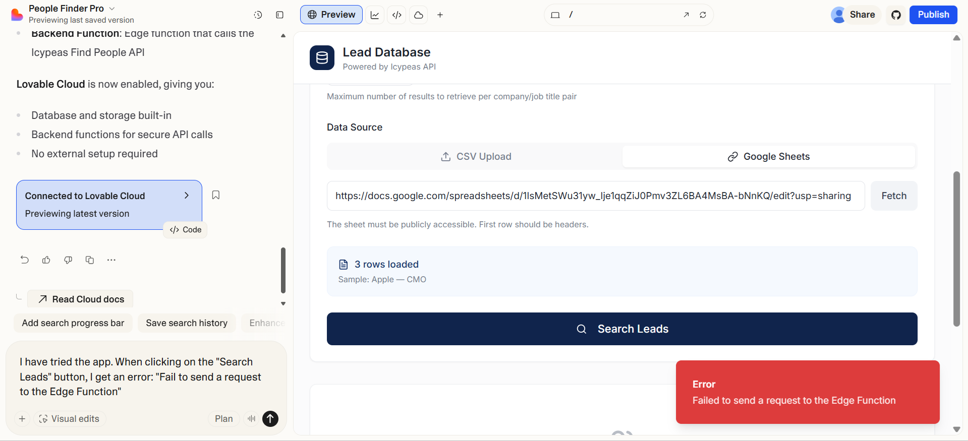 In the Lovable chat, I told the AI agent that I tested the app and found an error.